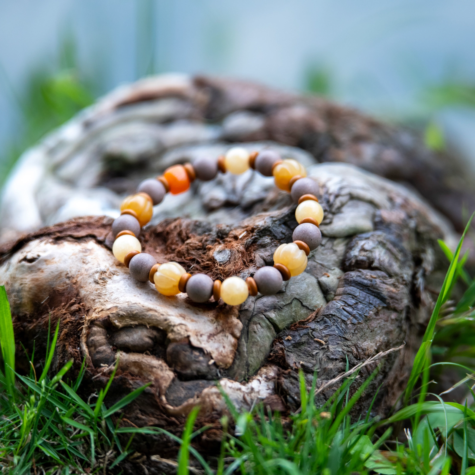This carefully curated piece combines solar-charged gemstones with organic elements to amplify confidence, creativity, and grounded prosperity.