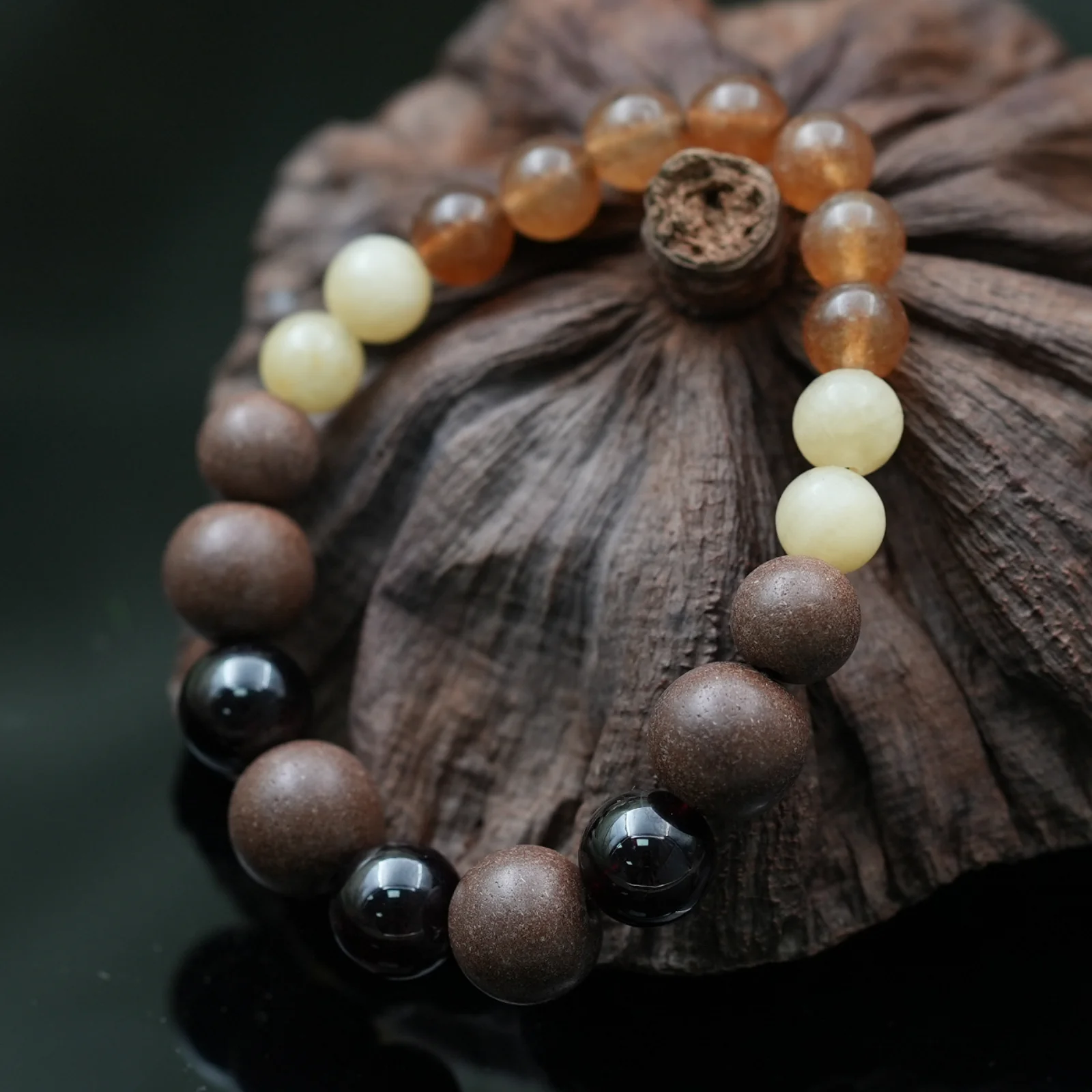 Garnet keeps your passion alive, Tourmaline Glass celebrates your quirks, Yellow Jade nurtures shared dreams, while the Dongpo bead inspires soulful conversations at twilight. This is love perfected through time.